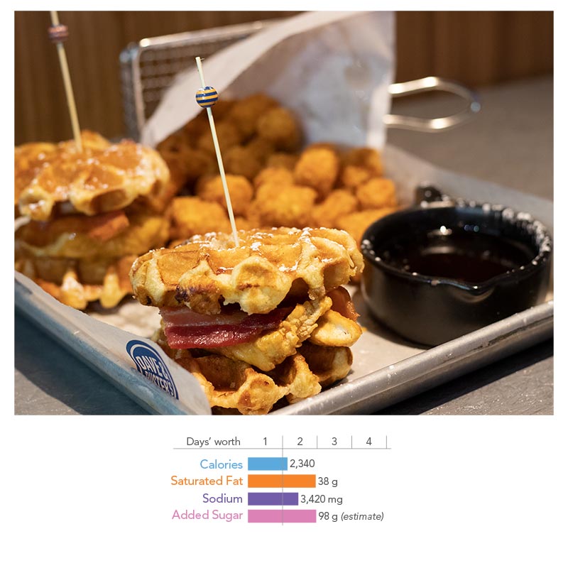 Take the Chicken & Waffle Sliders. Only the best chefs could turn white flour, sugar, and other “better” ingredients into 2,340 calories’ worth of fried chicken, bacon, mini Belgian waffles, maple syrup, and tater tots.
