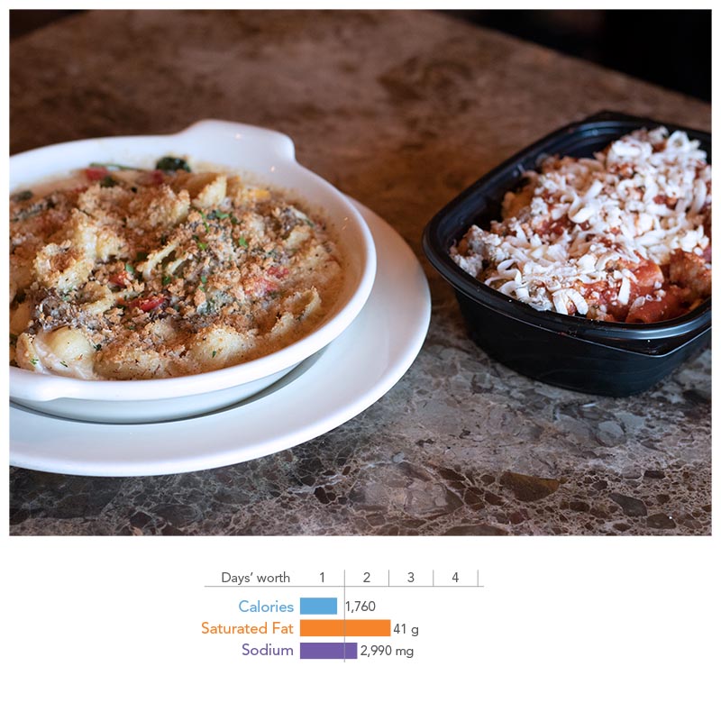 Let’s say you pick the Braised Beef al Forno to start. Who knew that orecchiette pasta, beef, peppers, spinach, and “truffle peppercorn sauce” could hit 1,760 calories?