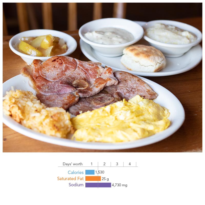 “Enjoy three farm fresh eggs, fried apples, hashbrown casserole, and grits...plus sirloin steak, two pork chops or country ham,” says Cracker Barrel’s menu. The Country Boy Breakfast “comes with All The Fixin’s” (biscuits, gravy, butter, and jam).