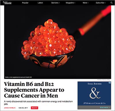 But the study that led The Atlantic to declare that B vitamins “appear to cause cancer in men” doesn’t hold a candle to far better evidence that B vitamins, even at high doses, don’t cause cancer.
