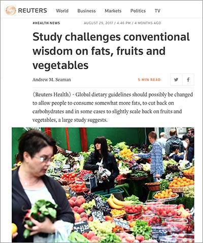 "Global dietary guidelines should possibly be changed to allow people to consume somewhat more fats, to cut back on carbohydrates and in some cases to slightly scale back on fruits and vegetables, a large study suggests,” Reuters reported in August.