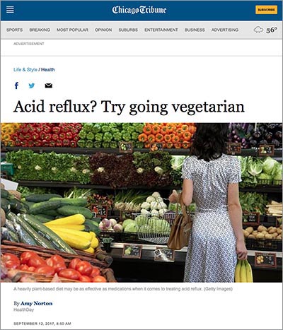 “A mostly vegetarian diet may provide relief similar to widely used medications for people with acid reflux, a new study suggests,” reported a HealthDay article in the Chicago Tribune in September.