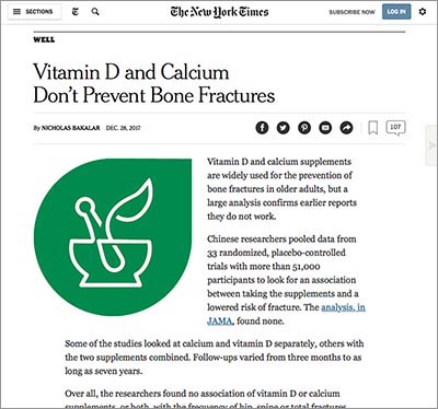 "Vitamin D and calcium supplements are widely used for the prevention of bone fractures in older adults, but a large analysis confirms earlier reports they do not work,” declared the online edition of the New York Times in December.