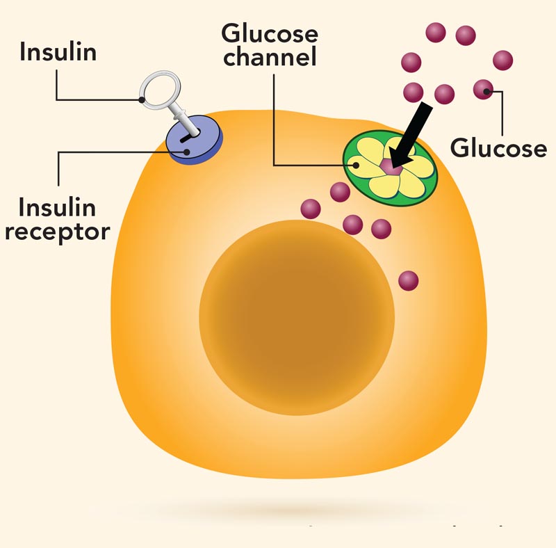 Insulin acts as a key that allows blood sugar (glucose) to enter the body’s cells, where it can be burned for fuel or stored.