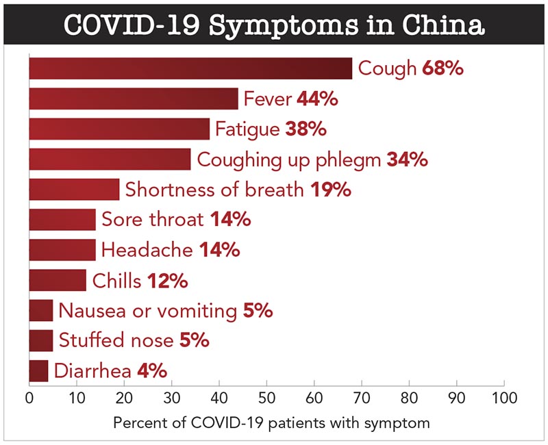 Among 1,099 hospitalized patients in China, the most common symptoms were coughing and fever.2