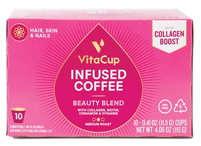 "You’re beautiful, let’s keep it that way,” says VitaCup Beauty Blend Infused Coffee with Collagen, Biotin, Cinnamon & Vitamins. It’s a mix of “all-star beauty ingredients intended for show-stopping hair, skin, and nails.”
