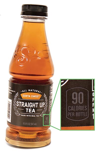 Each 18.5 oz. bottle has 90 calories (disclosed in barely visible gray-on-black print on the front label). That’s thanks to the 5 teaspoons of added sugar (more than 40 percent of a day’s worth).