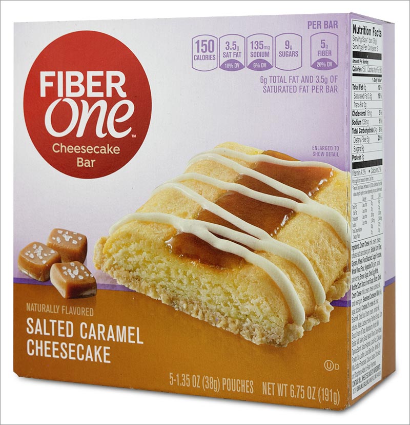 “5g of fiber so you can enjoy every bite,” says the Fiber One Salted Caramel Cheesecake Bar label.