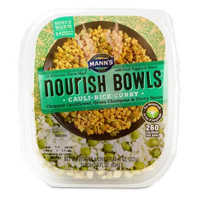“A delicious warm meal with fresh veggies & sauce.” That’s Mann’s Nourish Bowls.