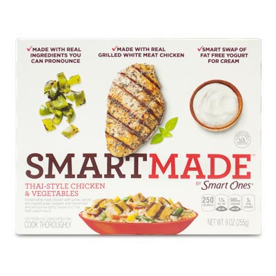 “Smart ingredient swaps that do not compromise taste,” say SmartMade bowls. Got that right. The Thai-Style Chicken & Vegetables swaps yogurt for some cream. The Roasted Turkey & Vegetables comes with roasted sweet potatoes, not white. And the Roasted Vegetables with Angel Hair delivers 100% whole-wheat pasta.