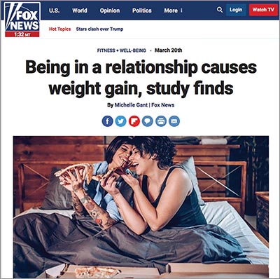 “According to a new study, which analyzed over a decade’s worth of data from more than 15,000 adults, couples are more likely to gain weight than those who are single,” said Fox, citing an article in the British tabloid The Sun.