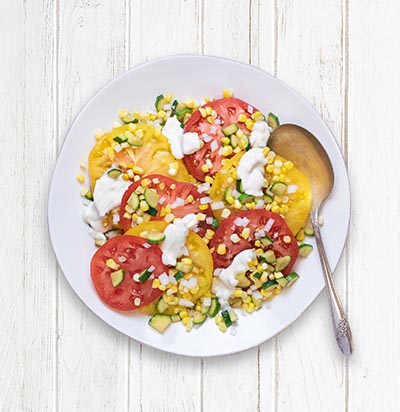 3. On a serving platter, layer the tomatoes and the zucchini-corn mixture. Spoon the sour cream sauce on top.
