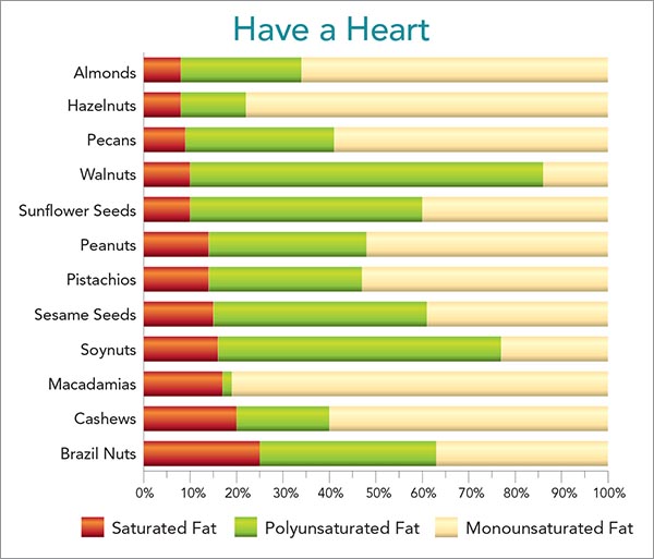 While most nuts and seeds have about the same amount of fat, the percentage that’s saturated, polyunsaturated, and monounsaturated varies. Most varieties (and their butters) should help lower LDL (“bad”) cholesterol, especially if they have more poly than sat fat. Walnuts, sunflower seeds, and soy have the most poly vs. sat. Brazil nuts, cashews, and macadamias have the least.