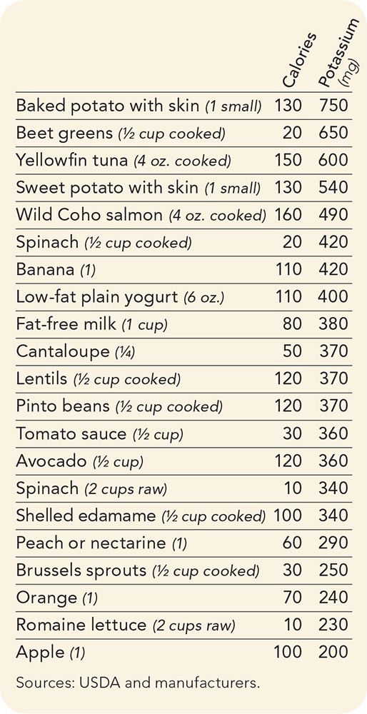 The goal: get 3,500 to 5,000 milligrams of potassium a day. You get the most bang for your calorie buck with fruits and vegetables.