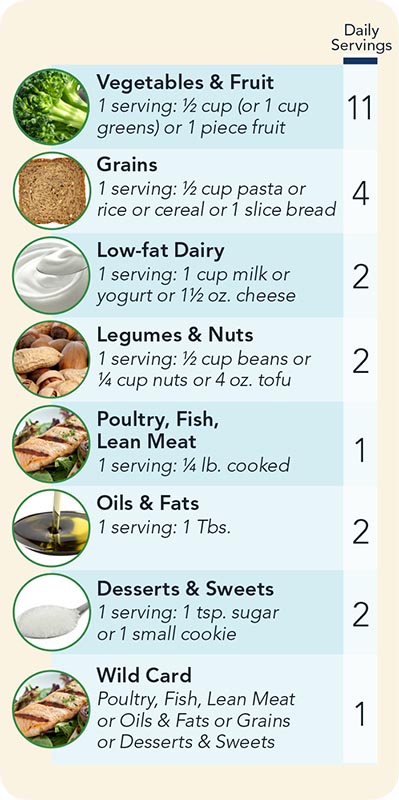 Load up on fruits and vegetables and shrink bad fats, added sugars, and salt. Here’s a 2,100-calorie version. (Note: servings are small.) For more tips on following a DASH-style diet, see our guide.