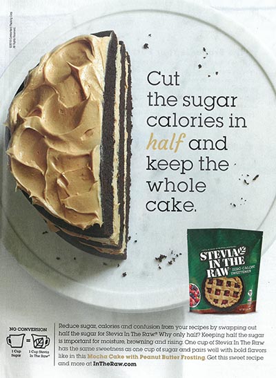 “Cut the sugar calories in half and keep the whole cake,” says the ad for Stevia In The Raw.