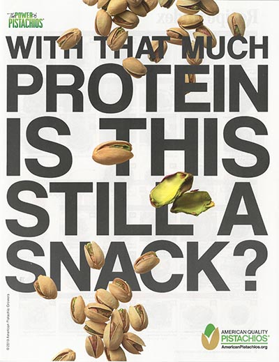 “With that much protein is this still a snack?” asks the American Quality Pistachios ad. Wow. Just how much protein are we talking about? You’d think the ad would say.
