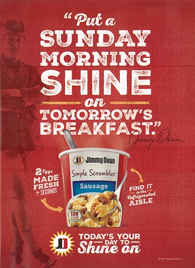 “2 eggs made fresh in seconds,” says the ad for Jimmy Dean Sausage Simple Scrambles.