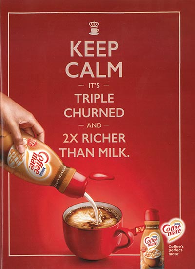 “Keep calm. It’s triple churned and 2X richer than milk,” gushes the ad for Caramel Latte Coffeemate coffee creamer.