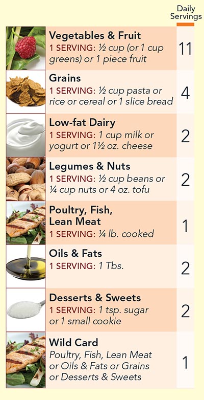 A DASH diet keeps a lid on blood pressure, which may protect your brain’s blood vessels. Here’s a 2,100-calorie version. A Mediterranean diet is similar, but you’d use the “Wild Card” for olive oil. (Note: Some serving sizes are quite small.)