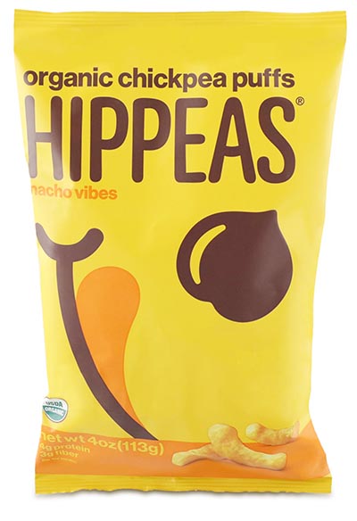 “Changing snacking for the better, one chickpea at a time,” says Hippeas about its vegan Nacho Vibes Organic Chickpea Puffs. “Kick back and take it easy ‘cuz these are nacho average puffs.”