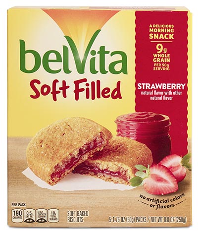 “belVita Soft Filled Soft Baked Biscuits are a tasty, nutritious combination of wholesome baked grains, paired with a flavorful filling to provide a delicious morning snack,” says the box.