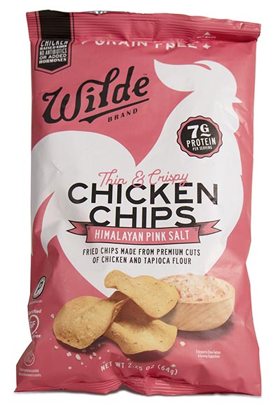 “We ditched the potato and replaced it with real chicken,” says Wilde Brand about its Thin & Crispy Himalayan Pink Salt Chicken Chips.