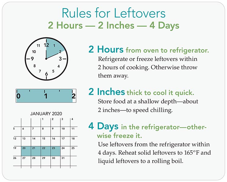 “If you don’t put leftovers away within two hours after cooking, toss them. And if you’re outside and it’s warmer than 90 degrees, food needs to be refrigerated within one hour.”