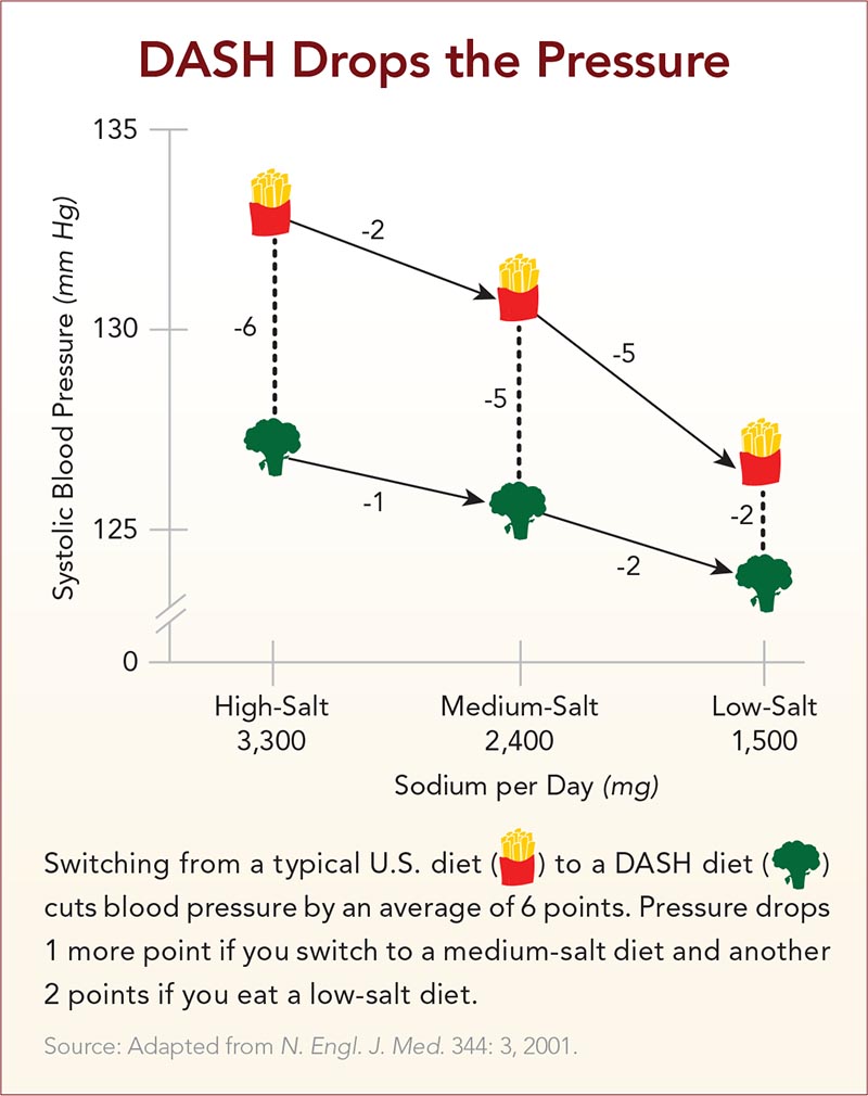 “The DASH diet alone can lower blood pressure as much as taking a blood-pressure-lowering drug,” says Sacks. “If you also cut salt, it can be superior to drug treatment.”