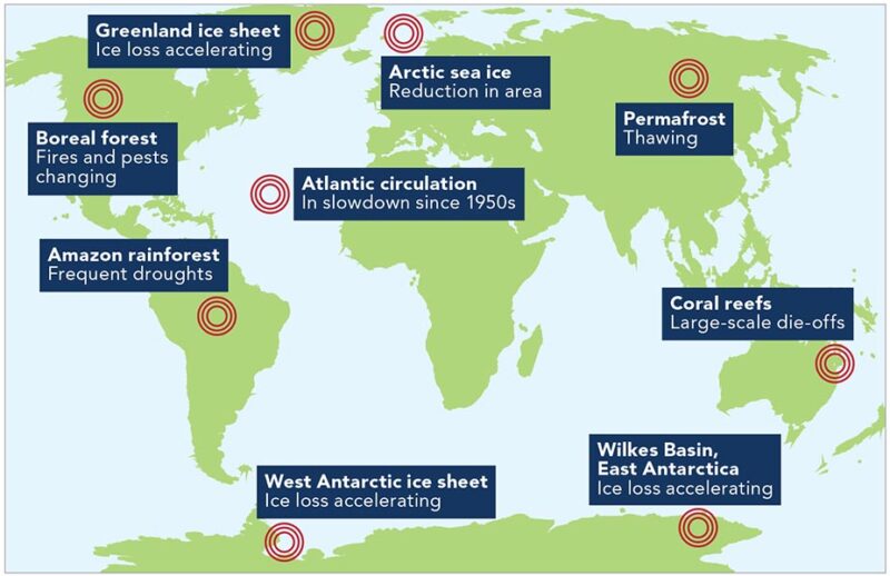 Among the events that could trigger a tipping point: melting Antarctic or Greenland ice sheets, loss of Arctic sea ice, or drought in the Amazon rainforest.