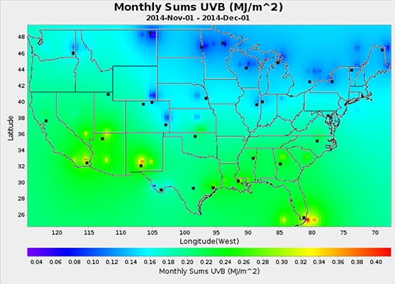 If you’re in a blue or turning-blue area—anywhere except the South and Southwest—in November, you’re not going to get much UVB sunlight to make vitamin D. By the end of December, the entire country—with the exception of South Florida and a few pockets in the Southwest—is solid blue.