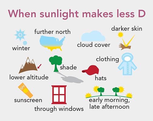 Another source: the sun. Ultraviolet (UVB) radiation from the sun penetrates uncovered skin and converts a compound in the skin into what eventually becomes vitamin D. But your skin’s ability to make vitamin D depends on where you live and what time of year it is. Here’s how the intensity of UVB changes from north to south and from summer to winter.